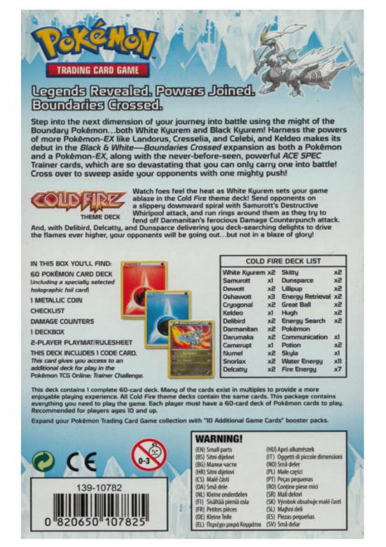 Watch foes feel the heat as White Kyurem sets your game ablaze in the Cold Fire theme deck! Send opponents on a slipper downward spiral with Samurott's Destructive Whirlpool attack, and run rings around them as they try to fend off Darmanitan's ferocious Damage Counterpunch attack. And, with Delibird, Delcatty, and Dunsparce delivering you deck-searching delights to drive the flames ever higher, your opponents will be going out...but not in a blaze of glory!