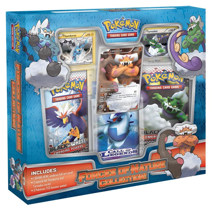 Winds howl...skies rage..and the earth trembles when you set free the power of the Pokémon Trading Card Game: Forces of Nature Collection! First, capture Landorus, the Abundance Pokémon, which—For the first time ever—fills the entire card with its might! Then, add special foil versions of the Cyclone Pokémon Tornadus and the Bolt Strike Pokémon Thundurus, plus three booster packs, and you have true forces to be reckoned with. Do you want to rule earth wind and sky? Your wishes are about to be granted!
