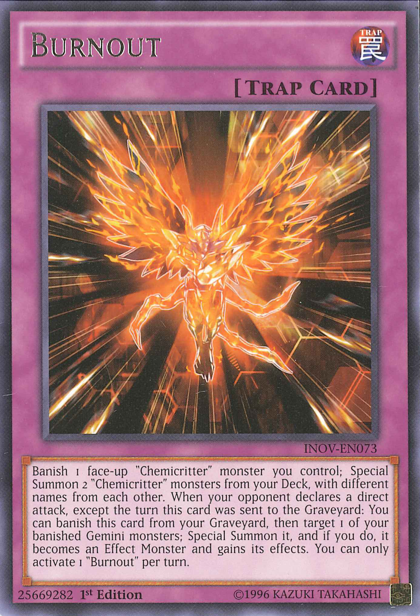 Banish 1 face-up "Chemicritter" monster you control; Special Summon 2 "Chemicritter" monsters from your Deck, with different names from each other. When your opponent declares a direct attack, except the turn this card was sent to the Graveyard: You can banish this card from your Graveyard, then target 1 of your banished Gemini monsters; Special Summon it, and if you do, it becomes an Effect Monster and gains its effects. You can only activate 1 "Burnout" per turn.